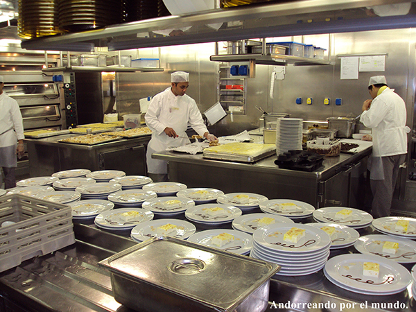 Día de navegación. Nos hicieron al pequeño grupo de españoles que nos encontramos en el crucero una excursión al interior de la cocina del barco. Fue una buena experiencia ver como se lleva a cabo tal trabajo, la coordinación y la limpieza que desarrollan los cocineros. Por la noche asistimos a la cena del capital.