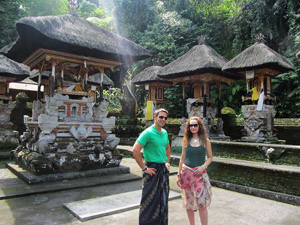 Por la mañana desayunamos y nos fuimos a ver el espectáculo de la danza de Barong en Ubud, donde el bien se encuentra con el mal. El espectáculo comienza con el sonido de instrumentos musicales típicos de Indonesia. Es una leyenda que narra una batalla entre el bueno Barong, que es una figura mítica mitad león y mitad dragón, impulsada por dos personas, y el malo Rangda, la bruja. Tanto Barong como Rangda luchan utilizando sus poderes. Cuando Barong va perdiendo sus ayudantes, empuñan sus Krises y atacan a Rangda. Entonces ella hace uso de sus poderes mágicos hasta tal punto que los hombres intentan suicidarse con sus kris. Por último, un sacerdote hace la ceremonia para poner fin al trance de los hombres y sacrifica a un pollo para proporcionar a los espíritus del mal, el equilibrio entre ellos. Es un espectáculo muy famoso en Indonesia. Compramos los tickets a un vendedor ambulante, pagamos 70.000 rupias por persona (4,94 € aprox.)
