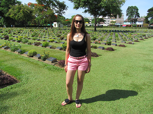 Visitamos el Museo Jeath, las siglas que dan nombre a este museo son escogidas de las distintas nacionalidades de los prisioneros de guerra (japoneses, ingleses, australianos, tailandeses, holandeses). Les obligaron a trabajar en la construcción del emblemático puente sobre el río Kwai. Es uno de los museos de guerra en Tailandia, sobre el ferrocarril de la muerte. Fue construido 1942-1943 por los aliados prisioneros de guerra bajo el mandato de los japoneses, en parte de los ferrocarriles entre Tailandia y Birmania. Lo primero que encontramos en su interior del museo son las cabañas de bambú, donde hay una colección de fotografías. Apreciamos los duros y difíciles trabajos que tuvieron que desempeñar y las condiciones en las que tenían que vivir. También observamos documentos y objetos de la época. El horario de lunes a domingo de 8:00 h a 18:00 h La entrada nos costó 30 bahts tailandeses por persona (0,79 € aproximadamente). Se localiza en Mueang Kanchanaburi District, Kanchanaburi, Tailandia. Nos dirigimos al Cementerio de los Prisioneros de la II Guerra Mundial, en este cementerio fue diseñado por Colin St Clair Oakes, se encuentran enterrados 1740 soldados de los 13000 prisioneros de la guerra que murieron durante la construcción del ferrocarril de Birmania-Tailandia. Abierto todos los días desde las 9:00 h hasta las 17:00 h La dirección es Dirección Saeng Chuto Road, Kanchanaburi.