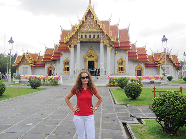 Visitamos el Templo de Mármol, también llamado Wat Benchamabophit. Es un templo budista, la construcción comenzó en 1899, mandada por el rey Chulalongkorn (Rama V), construido con mármol de carrara, importado de Italia. Dentro de la sala de ordenación hay un buda llamado Phra Buddhajinaraja, que fue ubicado en 1920. Actualmente, está ubicado en el Templo Wat Mahathat en Phitsanulok. Las cenizas del rey Chulalongkorn, se encuentra en este templo. En la galería que rodea a la sala de ordenación hay 52 estatuas de budas, recopiladas por el príncipe Damrong Rajanubhab. El horario de visitas todos los días de 8:00 h a 18:00 h La entrada nos costó 20 bahts tailandeses por persona (0,53 € aproximadamente). Se encuentra en 69 Avenue Road.