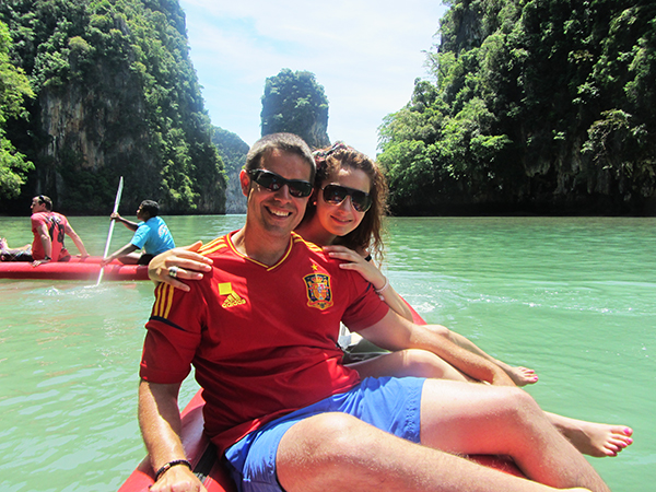 El Hotel JW Marriott Phuket Resort & Spa, hospedaje de cinco estrellas. Situado en 231, Mai Khao, Thalang District, Phuket. Llegamos para hacer el check-in y a costarnos. Al día siguiente, nos levantamos bien temprano, bajamos a desayunar al comedor del hotel, una vez acabado nos fuimos al embarcadero de Manoh, Phuket. Contratamos la excursión de James Bond Canoe. Es una isla situada en una de las bahías más bonitas de Tailandia, la Phang Nga. Se caracteriza por sus formaciones rocosas, rodeada de verde vegetación. Cogimos el barco que nos llevó a este magnífico lugar. Su primera parada fue en Isla Koh Panak, un paraje lleno de cuevas y lagos donde embarcamos en una canoa y recorrimos sus cuevas, apreciando las estalagmitas, estalactitas y la cantidad de murciélagos que había en su interior. En algunos tramos teníamos que tumbarnos totalmente, porque era imposible pasar sentados.