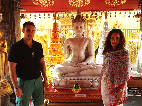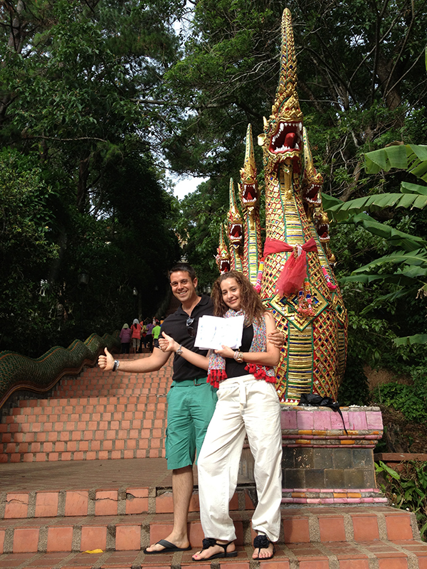 Abandonábamos el Hotel Le Meridien de Chiang Rai para Salir hacia Chiang Mai. Visitamos el Templo de Doi Suthep, santuario budista, contiene 309 escalones. Para llegar al lugar hay que aparcar el coche en un aparcamiento y subir andando unos 309 escalones aproximadamente. También hay la posibilidad de subir en ascensor, tiene un coste de 20 bahts por persona (0,54 € aproximadamente). Nosotros decidimos subir a pie. Una vez que llegamos arriba, donde se ubica el templo, es obligatorio quitarse el calzado y la vestimenta debe ser de piernas cubiertas hasta la rodilla. Abierto desde las 6:30 h hasta las 18:30 h La entrada nos costó 30 bahts por persona (0,80 € aproximadamente). Se encuentra en Wat Phra That Doi Suthep Road Srivijaya Suthep Mueang Chiang Mai District Chiang Mai.