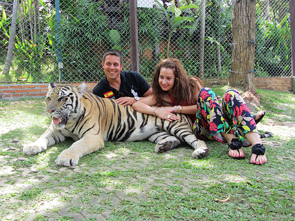 Nos fuimos a Tiger Kingdom, es un parque donde a viajeros y turistas se les permite estar en contacto, acariciar y ver desde cerca durante 30 minutos a estos increíbles animales dentro de una enorme jaula, siempre acompañado de profesionales del parque. Al sacar la entrada puedes elegir el tamaño del tigre con el que quieres tener contacto. Desde cachorros hasta tigres medianos o grandes. Hay varios precios dependiendo del tipo de entrada que saques. Nosotros elegimos los tigres de mediano y gran tamaño, fue una experiencia inolvidable. Hay mucha gente que piensa que esto es un horror para los animales, nosotros también lo pensábamos. Tras nuestro paso por el parque hemos podido comprobar que no es cierto. Están muy bien cuidados y totalmente sanos, los protegen de cazadores furtivos. En estos países asiáticos, si la población encuentra un animal como tigres, leones o leopardos libres, lo primero que hacen es cazarlos y consumir sus carnes, ellos creen que si hacen esto cogen la fuerza del animal. Abierto todos los días de 9:00 h a 18:00 h La entrada nos costó 1.000 bahts por persona (26,33 € aprox.) Se localiza en 51/1 Moo 7, Rim Tai, Mae Rim District, Chiang Mai 50180, Tailandia.