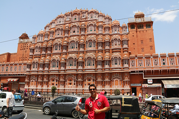 Hawa Mahal, también llamado Palacio de los Vientos. Fue construido por orden del maharajá Sawai Pratap Singh, en el año 1799. Edificado en arenisca roja y rosa. Compuesto por un total de 953 pequeñas ventanas y tiene cinco plantas. La función principal que desempeño este inmueble fue permitir a las mujeres reales poder observar la vida de las calles de la ciudad, sin ser vistas. Lo fotografiamos desde el exterior, porque cuando llegamos ya estaba cerrado. Abierto desde las 9:00 h hasta las 17:00 h La entrada tiene un coste de 5 rupias por persona (0,08 € aproximadamente) si llevas cámara hay que sumar 30 rupias más (0,42 € aproximadamente) y cámara de vídeo 70 rupias (0,97 € aproximadamente). La dirección es Hawa Mahal Rd, Badi Choupad, Pink City, Jaipur, Rajasthan.