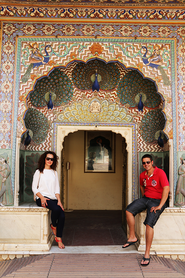 Para entrar en el Palacio Chandra Mahal, hay cuatro puertas diferentes, cada una dedicada a un Dios y a una estación del año. La que más nos llamó la atención fue la del pavo real, dedicada a la diosa Laksmí (Belleza) y a la estación del Monzón.
