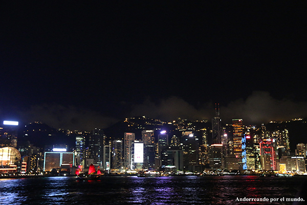 Por la noche asistimos al espectáculo más conocido de Hong Kong Symphony of Lights, es un espectáculo de luces y sonido que iluminan a 45 edificios más representativos de la ciudad. Se realiza todos los días a las 20:00 h Hay varios puntos para contemplar el espectáculo, nosotros lo contemplamos en Tsim Sha Tsui, entre la Avenida de las Estrellas y el Centro Cultural de Hong Kong. Es gratuito.