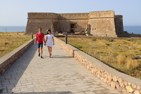 Entre los monumentos destacables se encuentra el Castillo de Guardias Viejas construido en el siglo XVIII, como fortificación costera, para defender el litoral de Guardias Viejas de ataques de piratas y corsarios. Se vio destruido en parte, en el siglo XIX, durante la Guerra de la Independencia, fue reconstruido en el año 1817. Es de planta rectangular y está edificado alrededor de un patio de armas desde el que se accede a la batería semicircular y a las estancias de la tropa. Hoy en el interior alberga una exposición permanente de uniformes militares y armas de la época Napoleónica. Desde el año 1980 está declarado Bien de Interés Cultural. La fortificación es utilizada en ocasiones para eventos musicales, en la temporada de verano se realizan conciertos musicales y teatrales, celebraciones de bodas civiles. La entrada es gratuita. ¡Recuerda!, los lunes permanece cerrado. El teléfono es: (+34)950541014. La dirección es Calle del Muro núm. 20, Los Baños de Guardias Viejas.