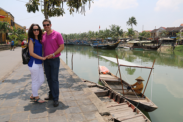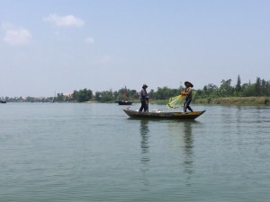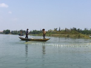 Al terminar cogimos un pase para pasear en un barco por el río Thu Bon, donde observamos a pescadores, pescando, la naturaleza y vegetación del lugar. Por el trayecto en barco pagamos 3 dólares americanos por persona (2,76 € aproximadamente). Almorzamos en un restaurante para probar la comida típica de la zona.