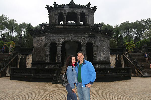 Seguimos visitando la Tumba Khai Dinh. Fue construida entre 1920 hasta 1931, ubicada sobre la ladera de una colina al sur de la ciudad de Hue. Fue mandada construir por el propio emperador Khai Dinh, aunque él no vio acabada la construcción. Su estructura está compuesta por mármol y cemento, una mezcla de estilo europeo con vietnamita. Para acceder a su entrada y al primer patio hay que subir unos 36 escalones con una baranda en forma de dragón. Para subir al segundo tramo hay que subir 26 escalones hasta llegar al patio de Honor, donde se encuentra el pabellón de la Estela; y en la parte superior está el Palacio de Chien Dinh, donde se pueden contemplar fotografías de Khai Dinh, el emperador, objetos personales, etc. Hay un total de siete Tumbas Imperiales en la ciudad, nosotros solo visitamos la de Tu Duc y Khai Dinh. Abierto de 7:00 h a 11:30 h por la tarde de 13:30 h a 17:30 h La entrada nos costó 80.000 dongs por persona (3,30 € aproximadamente).