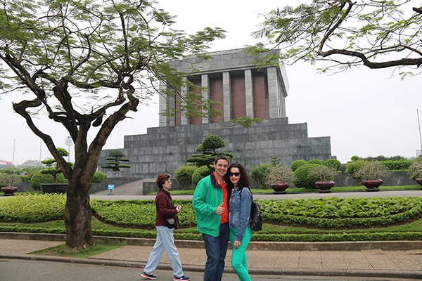 Desayunamos en el hotel y luego nos fuimos a visitar el Mausoleo de Ho Chi Minh, es una tumba donde descansan los restos del líder revolucionario fundador del comunismo vietnamita. Organizó la revolución y la lucha de Vietnam por su independencia. Es un ser muy querido por el país de Vietnam. Antes de entrar en su interior hay que pasar un detector de metales, está totalmente prohibido entrar con cámaras fotográficas, vídeo, etc. La vestimenta debe ser piernas tapadas hasta la rodilla y hombros, tanto para hombres como mujeres. Os recomendamos visitarlo pronto, debido a que es un lugar muy popular y las filas son muy largas. Solo permanece unas horas abierto por la mañana. Antes de visitarlo es necesario saber el horario, porque hay horas determinadas para la visita. Una parte del año permanece cerrado al público, debido a que envían al cuerpo para revisarlo a Rusia. Nos sorprendieron las extremadas medidas de seguridad que tienen, lo bien custodiado y conservado que se encuentra el cuerpo de Ho Chi Minh.