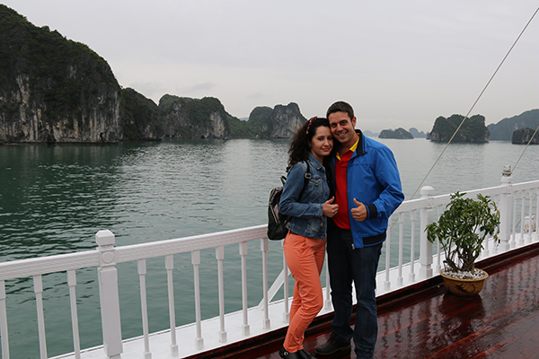 Al día siguiente, sonó el despertador, bajamos a desayunar al comedor del hotel, una vez acabada la comida hicimos el check-out, abandonando la ciudad de Hanói, para dirigirnos a Hong Gai, es una aldea en la Bahía de Ha-Long, se localiza al norte del país a unos 300 km de la ciudad de Hanói. La Bahía de Halong, está formada por más de 200 islotes a lo largo de 120 km de costa, con una extensión de más de 15.000 m². Este lugar está declarado Patrimonio de la Humanidad por la Unesco desde el año 1994. Es uno de los sitios que más nos gustó de Vietnam. Embarcamos y realizamos un crucero de día completo y noche abordo de un barco. Aunque el barco estaba casi vacío, no había ningún tipo de animación a bordo y no disponíamos de televisión e internet, lo pasamos genial contemplado los magníficos paisajes que nos ofrecía la naturaleza. Hay varias compañías que hacen este tipo de excursión por la bahía. Nosotros pagamos por un día completo y una noche 99 dólares americanos por persona (90,94 € aproximadamente). El paraje ofrecía un paisaje lleno de aguas de color turquesa con esas formaciones rocosas enormes que sobresalían del agua. También tuvimos la oportunidad de ver juncos y sampanes. Nos encantó pasar la noche en el barco y observar tal belleza natural.