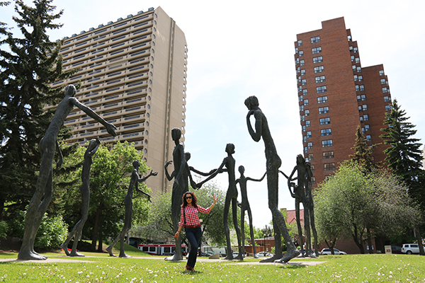 Salimos y a pocos metros del hotel nos encontramos un parque donde había unas esculturas de bronce que representan a mujeres y hombres de grandes dimensiones haciendo un círculo. Esta escultura llamada The Family of Man, fue diseñada por Mario Armengol Torrella, pintor, dibujante y humorista gráfico. La observamos y tomamos algunas fotografías. Calgary es una ciudad donde a cada paso te encuentras esculturas.