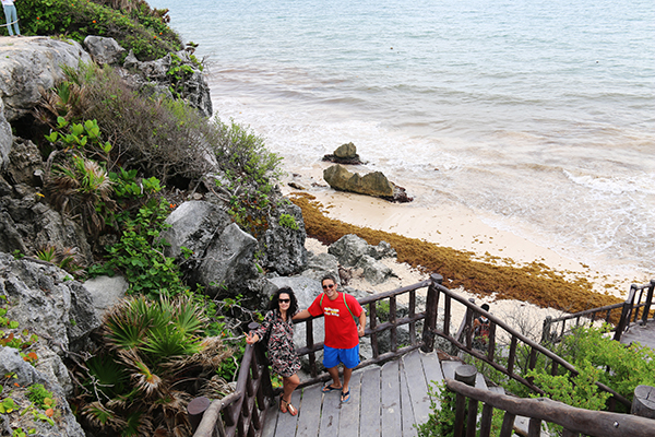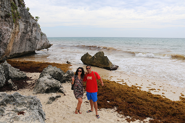 Algo destacable que hace este lugar diferente a otros yacimientos arqueológicos, es la playa que se encuentra dentro de él. Es una playa de arena fina con aguas cristalinas rodeada por acantilados. Dispone de muy buen acceso, se puede bajar a ella mediante unas escaleras de madera con baranda. Esta vez que la visitamos no era apta para el baño. Llevaban unos meses en toda la zona de la Riviera Maya sacando algas marinas a causa de las tormentas. Se encontraba una franja pegada a la orilla del mar de algas que ofrecían una fea imagen del lugar y un desagradable olor a descomposición. No había nadie bañándose en el sitio. Nos quedamos un poco decepcionados, recordando aquellas imágenes que teníamos en la memoria, que eran totalmente diferentes a las que estábamos contemplando.