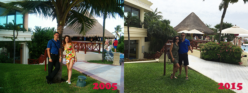 Llegamos y nos esperaban familiares y un grupo de amigos de nuestra tierra, El Ejido. La aventura empezaba. El hotel seguía igual que cuando estuvimos por primera vez, totalmente llenó de gente. Aquí os mostramos una foto tomada de nosotros en 2005 y al lado la actual de 2015, se pueden apreciar cambios en nosotros y en el sitio. El tiempo pasa chicos y es verdad que todo cambia.