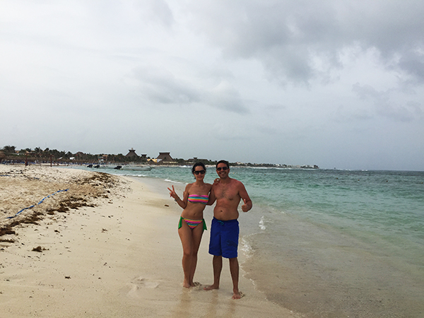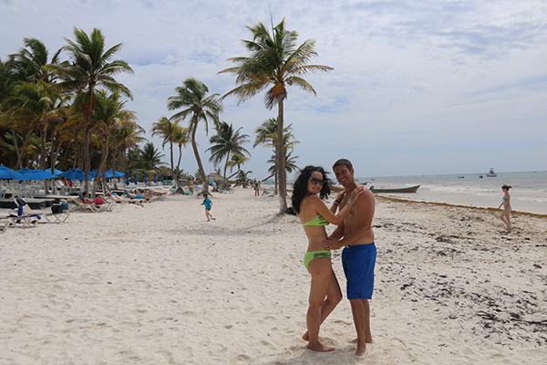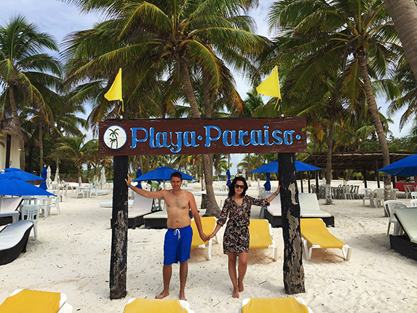 Una vez encontrados ya si nos fuimos a Playa Paraíso, se encuentra a unos 500 metros aproximadamente de distancia de las ruinas de Tulum. Es una costa de arena fina y aguas cristalinas en un ambiente de palmeras, típico del caribe, lleno de tranquilidad. Aunque en la orilla se encontraban algas, no eran tantas como en la anterior zona y no presentaban estado aún de descomposición y mal olor. Pasamos gran parte del día bañándonos y tomando el sol. Almorzamos en un chiringuito que se ubicaba en el lugar.