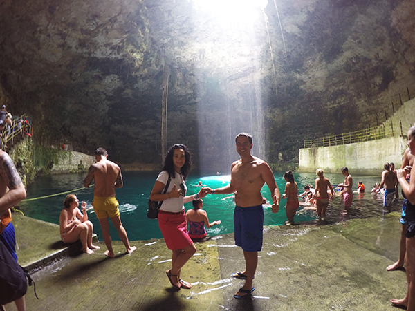 Seguimos la ruta hasta llegar a un Cenote. ¿Qué es un cenote?, es una dolina inundada de origen kárstico que se encuentra en algunas cavernas profundas como consecuencia de haberse derrumbado el techo de una o varias cuevas. Ahí se juntan las aguas subterráneas formando un estanque más o menos profundo. Existen varios tipos de cenotes: a cielo abierto, subterráneos o en gruta. La verdad es que estuvo genial, disfrutamos un montón.