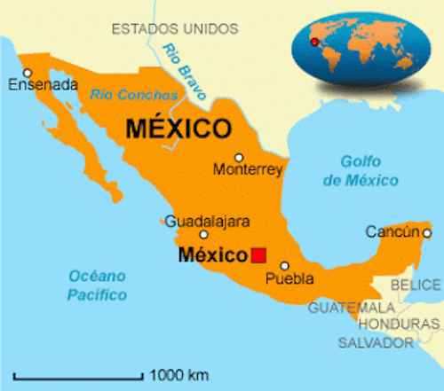 México, ubicado en el continente americano, cuenta con una superficie de 1.964.375 km² y una población de 122.000.000 habitantes aproximadamente. Su capital es la Ciudad de México. Nosotros en este viaje nos fuimos a visitar la Riviera Maya, zona costera que ofrece unas increíbles playas de arena dorada que contrasta con sus aguas cristalinas, visitamos Chichén Itzá, donde se encuentra la gran pirámide de Kukulcán. Tulum donde hubo una ciudad maya en el pasado con un activo puerto comercial, podemos destacar su castillo. El parque temático de Xcaret, el acuario natural de Xel-Ha, un cenote, etc.