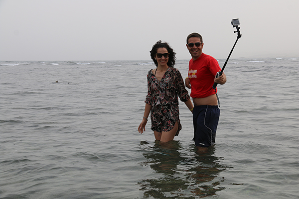 Nos desplazamos a Shark Bay, la bahía donde se encuentran los tiburones tigres nadando a escasos metros de nosotros. Fue toda una experiencia. Se pueden observar al fondo de la fotografía las aletas de los tiburones. Bueno, hay que decir que nosotros ya habíamos tenido la oportunidad de bañarnos con tiburones en nuestro viaje por Maldivas.