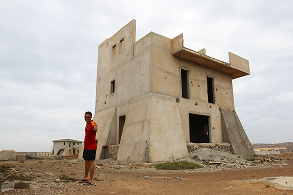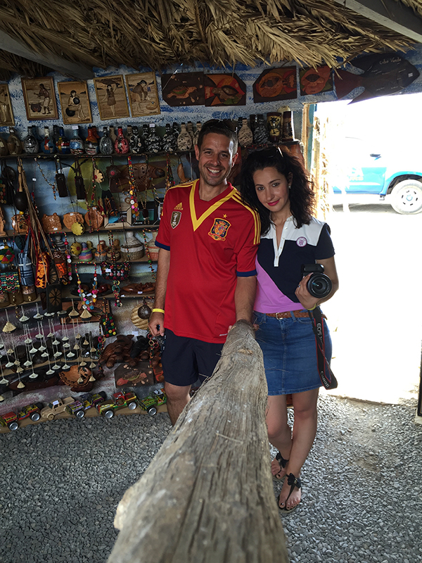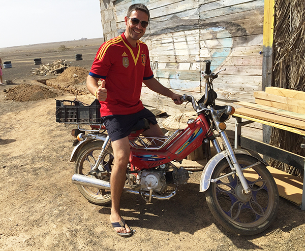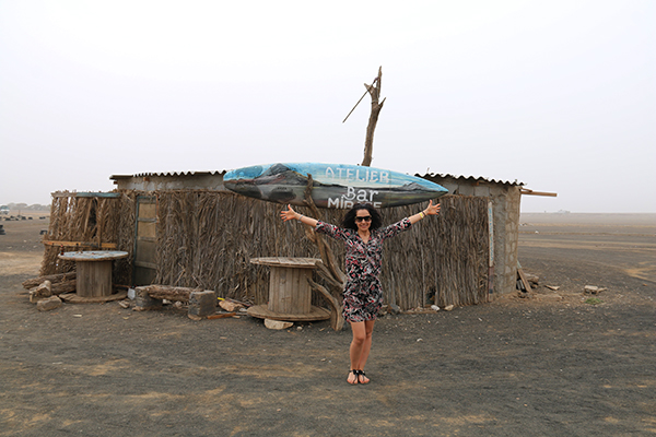Este fue el bar y tienda de souvenirs que encontramos en la zona. ¿Qué os parece? Auténtica África. ¡Mirad!, a Sergio montado en una moto que en Europa es una reliquia y en Isla de la Sal, es un lujo tener una de estas.