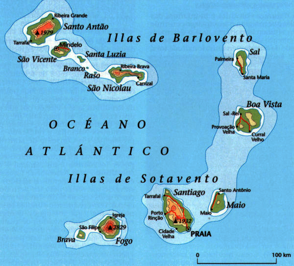Cabo Verde es un país de África formado por un archipiélago de diez islas y cinco pequeños islotes en el océano Atlántico, frente a la costa de Senegal. Las Islas de Barlovento están compuestas por: Isla de la Sal, Boa Vista, São Nicolau, Santo Antão, São Vicente y Santa Luzia. Las Islas de Sotavento formadas por: Maio, Santiago, Fogo y Brava. Los cinco pequeños islotes. La capital del país es Praia, que se localiza en la isla de Santiago. Estas islas fueron descubiertas en el siglo XV por los portugueses, quienes las colonizaron, estaban prácticamente desiertas. Cabo Verde fue colonia portuguesa hasta 1975.
