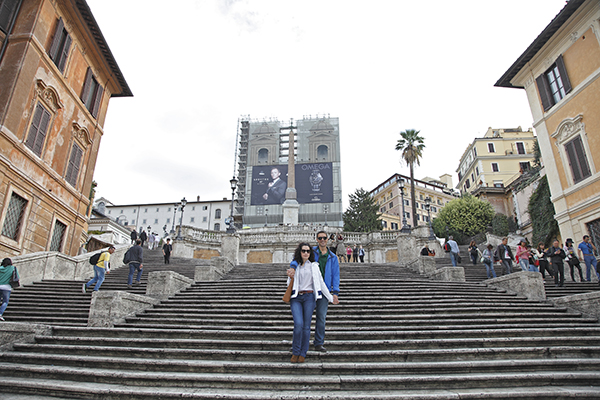 Justo delante de la iglesia está instalado un Obelisco por el Papa Pío en el año 1789. Bajamos y anduvimos por la Vía dei Condotti, donde se ubican numerosas tiendas de marca. La Columna de la Inmaculada que conmemora el Dogma de la Inmaculada Concepción fue puesta en el lugar en el año 1856.