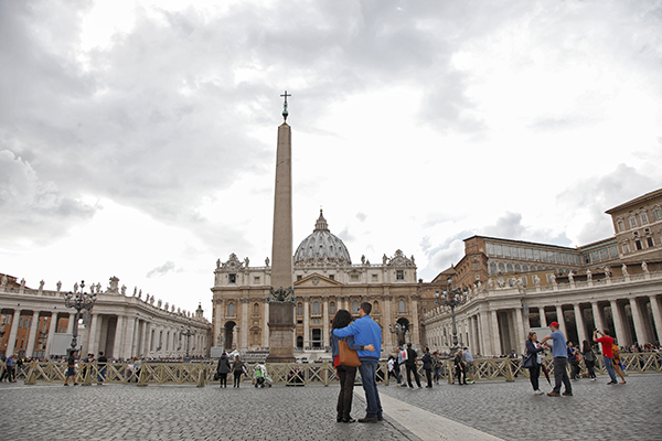 La Plaza de San Pedro, fue construida a mediados del siglo XVII por Bernini. Cuenta con unas dimensiones de 240 metros de ancho y 320 metros de longitud. En el centro se encuentra un obelisco de 25 metros de altura y dos fuentes, una llamada Maderno y otra Bernini. Os podemos decir que es una de las plazas más bellas que hemos visitado.