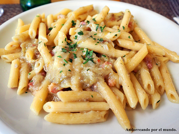 Hicimos una parada para almorzar cerca de esta plaza en un restaurante, donde probamos unos deliciosos platos de pasta (macarrones a la carbonara).