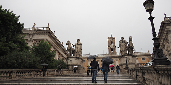 Seguimos hasta llegar a la Plaza del Campidoglio, que se sitúa en la Cima de la Colina Capitolina. Para llegar a ella hay que subir una rampa escalonada. Fue la primera plaza moderna diseñada por Miguel Ángel, en Roma. En el centro se ubica una réplica de la estatua de Marco Aurelio, la original está expuesta en los Museos Capitolinos. Bueno, pasamos unos minutos en el lugar y nos tuvimos que marchar y coger el autobús para regresar al hotel porque empezó a llover muy fuerte. Estábamos ya empapados de agua, era imposible sacar fotografías.