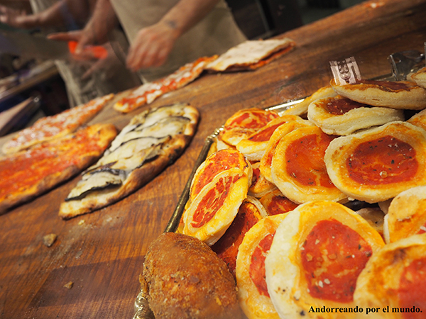 Hicimos una parada para almorzar unas porciones de pizza, la consumimos en el local porque en la calle estaba lloviendo muy fuerte. Italia es un país que ofrece una gastronomía rica en pasta y pizza, además resulta económico para ser un país perteneciente a Europa. Los restaurantes italianos ofrecen una gran calidad en sus productos. Las pizzerías: son locales baratos y especializados en pizzas. Si el tiempo acompaña, una buena opción es pedirla para llevar y comer por el camino. Los locales de pizza al peso: aunque también son como pizzerías, estos locales ofrecen diferentes pizzas variadas y es posible comprar el trozo que se quiera. Se trata de una buena opción para comer de forma rápida, al mediodía o por la noche, y económico.