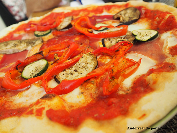Hicimos una parada para almorzar unas porciones de pizza, la consumimos en el local porque en la calle estaba lloviendo muy fuerte. Italia es un país que ofrece una gastronomía rica en pasta y pizza, además resulta económico para ser un país perteneciente a Europa. Los restaurantes italianos ofrecen una gran calidad en sus productos. Las pizzerías: son locales baratos y especializados en pizzas. Si el tiempo acompaña, una buena opción es pedirla para llevar y comer por el camino. Los locales de pizza al peso: aunque también son como pizzerías, estos locales ofrecen diferentes pizzas variadas y es posible comprar el trozo que se quiera. Se trata de una buena opción para comer de forma rápida, al mediodía o por la noche, y económico.