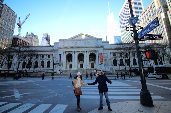 Nos levantamos, bajamos a recepción a esperar a los amigos para empezar el día de visitas. Bueno, antes hicimos una parada para desayunar. Nos dirigimos a la zona Wall Street, Antes pasamos por la puerta de la Biblioteca Pública de Nueva York, considerada como una de las más importantes del mundo y con mayor fondo bibliográfico sobre América. Este edificio ha aparecido en muchas escenas de películas.