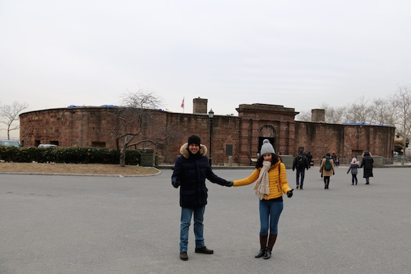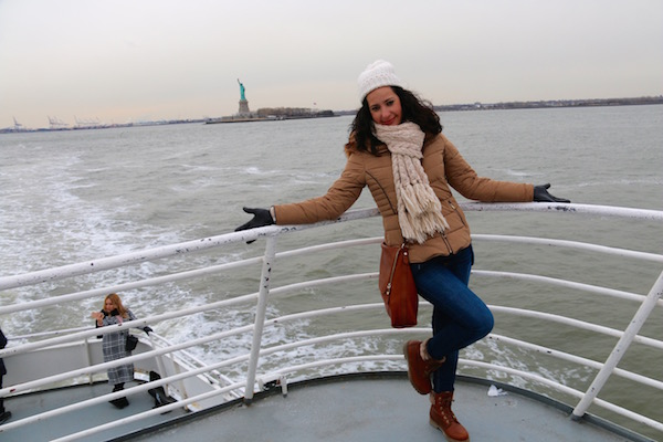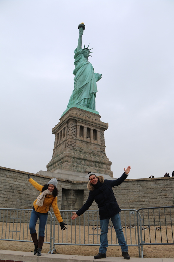 Nos desplazamos hasta el Castillo de Clinton, donde compramos los tickets del ferry para ir a la Estatua de la Libertad y a la Isla de Ellis. Los ferris comienzan el trayecto a las 8:30 h y la última salida es las 16:30 h tenerlo en cuenta. El ticket nos costó 5 dólares americanos por persona (4,56 € aproximadamente). Tomamos el ferry y la primera parada era la Estatua de la Libertad, que es el símbolo más representativo de Nueva York. Quiere decir «La libertad esclarece el mundo» No pudimos subir a su mirador porque las entradas estaban agotadas hasta el mes de abril. Nos tuvimos que conformar con contemplarla desde el exterior. Nos empezó a nevar y a caer sobre las chaquetas unos pocos copos de nieve.