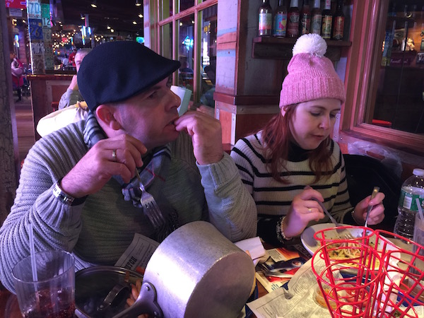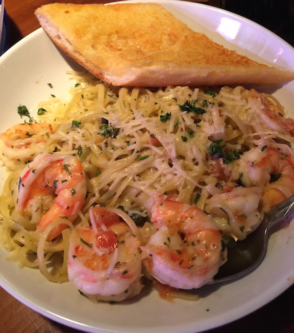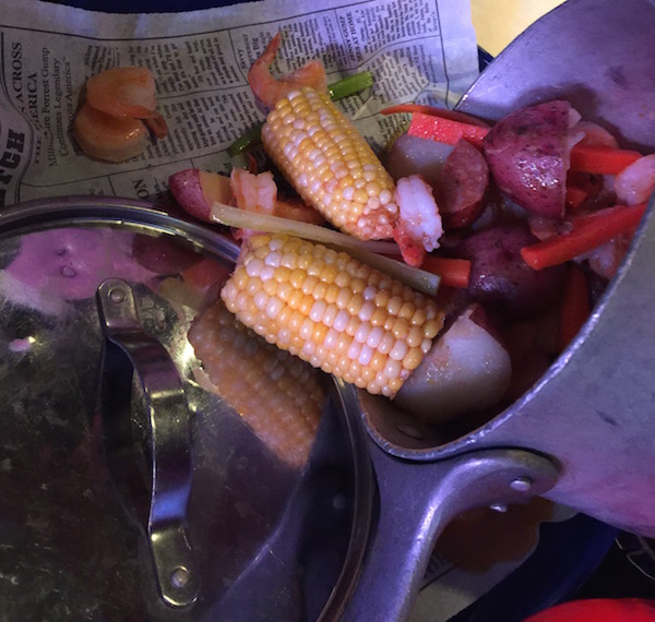 Decidimos cenar con los amigos en un restaurante de comida americana donde la especialidad son las gambas, casi todos los platos llevan este ingrediente. Bueno, nosotros elegimos un plato de pasta para cambiar un poco y nuestros amigos lo siguiente: Sonia pidió lo mismo que nosotros, pero Antonio eligió otro diferente, ni siguiera, nos dejó que le tradujéramos los ingredientes que llevaba su plato. Quería ser diferente, la sorpresa para todos fue su plato. Era una olla llena de panochas de maíz, patatas cocinadas, chorizo y gambas. No os podéis hacer una idea de lo que reímos y la cara que puso cuando le trajeron el plato. Os podemos asegurar que los siguientes días miraba los platos que consumía la gente en los restaurantes y pedía eso.