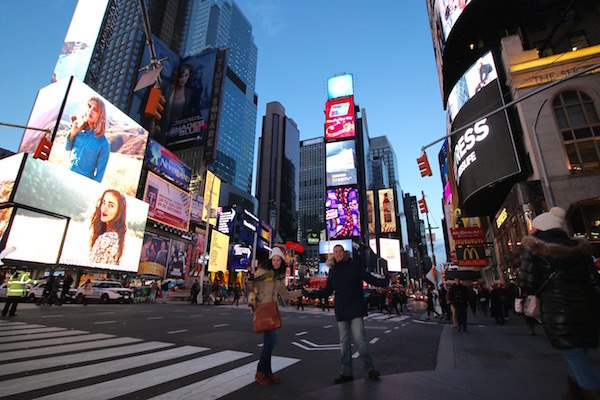 Dejamos las maletas y nos fuimos a explorar la ciudad. Era ya casi de noche, queríamos mostrarles a nuestros amigos Times Square, localizada en el cruce de la Avenida Broadway, y la Séptima Avenida. Conocida por sus luces y carteles publicitarios, es la zona más animada por la noche de Nueva York. Contemplamos el lugar y tomamos unas fotografías.