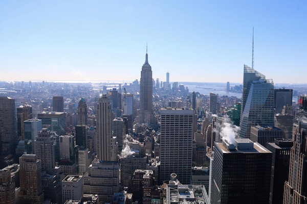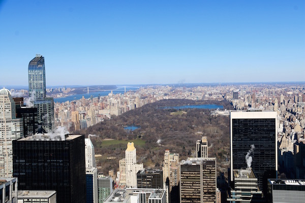Nos fuimos hasta Rockefeller Center, conjunto de diecinueve inmuebles que se encuentra en el centro de Nueva York. En el edificio de General Electric se localiza el mirador Top of The Rock. Es un observatorio desde el cual se pueden tener unas vistas panorámicas de 360 grados de la ciudad. En la planta 67 y 69 hay una terraza protegida y en la planta 70 la terraza es totalmente al aire libre. La entrada tiene un coste de 32 dólares americanos por persona (29,15 € aprox.) Una vez que subes puedes permanecer el tiempo que quieras. En la parte norte se pueden apreciar edificios como: The Equitable Tower, Hearst Tower, Time Warner Center, Cityspire Center, George Washington Bridge, Central Park, Los barrios de Harlem y Bronx. En la zona nordeste: Yankee Stadium, 9W 57TH Street, General Motors Building, Trump Tower, IBM building, Sony Building, RFK Bridge. En la zona este: Bloomberg Tower, Laguardia Airport, Citi Field, Citigroup Center, Ed Koch Queensboro, Barrio de Queens. En la zona sudeste: Citigroup Building, East River, Trump World Tower, Tower 49, JFK International Airport, United Nations. En la zona sur: 383 Madison, Chrysler Building, Met Life Building, L´Oreal, Williamsburg Bridge, French BLDG, Barrio de Brooklyn, Manhattan Bridge. En la zona suroeste: Brooklyn Bridge, Verrazano- Narrows Bridge, Old Met Life Tower, Empire State, World Trade Center Site, Statue of Liberty, Bryant Park, Goldman Sachs Tower. En la zona oeste: Bank of America Tower, New Jersey, Condé Nast Building, Times Square, Hudson River, New York Times Building, One Astor Plaza. La página web: https://www.rockefellercenter.com