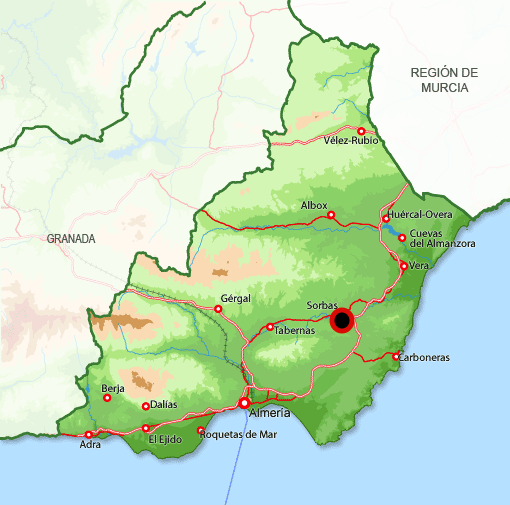 Sorbas es un municipio de la Comarca Levante Almeriense, con una superficie de 249,16 km², a una altitud de 409 metros sobre el nivel del mar. Se encuentra la provincia de Almería, pertenece a la Comunidad Autónoma de Andalucía. Está a una distancia de casi 57 km de la capital de provincia, Almería.