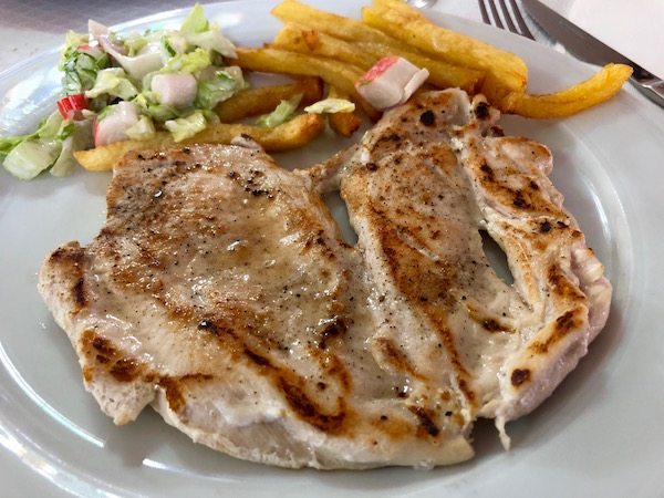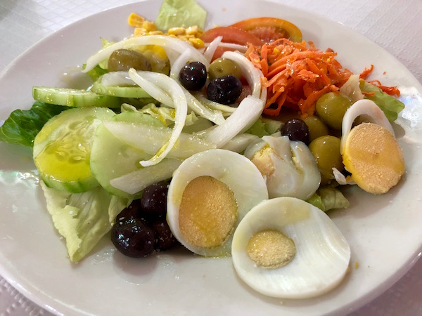 Fuimos hasta el Café Bar Restaurante el Fogón donde pedimos el menú del día, había varios platos en donde elegir. Ambos elegimos el mismo, una ensalada al centro para compartir, de entrante pedimos un revuelto de ajetes con huevo y champiñones, de plato principal una pechuga de pollo a la plancha y de postre melón, de bebida dos refrescos. Pagamos un total de 12 € por persona. La comida es bastante casera. El menú de lunes a viernes cuesta 11 € por persona, los sábados 13 € y los domingos 16 €. Además, dispone de comida a la carta. El teléfono es: (+34)950364160. Situado en la Ctra. Nacional 340 Km 496, Sorbas.