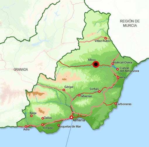 Albox es un municipio de la Comarca del Valle del Almanzora, con una superficie de 168,42 km². Está formada por las localidades: Albox, Aljambra, Fuente del Marqués, Llano de las Ánimas, Llano del Espino, Llano de los Olleres, La Molata y Las Pocicas. A una altitud de 420 metros sobre el nivel del mar. Pertenece a la provincia de Almería, a la Comunidad Autónoma de Andalucía. ¡Ven a conocer Albox!