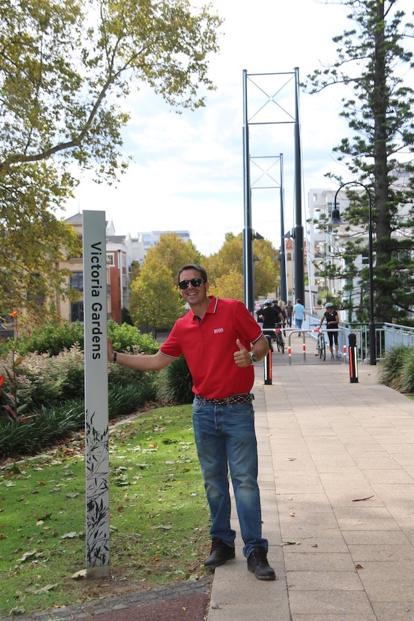 Nos desplazamos hasta Claisebrook Cove, es una entrada de agua artificial del río Swan, donde hay amarres y embarcaciones para navegar. Hay un puente llamado Trafalgar, que es un viaducto peatonal que cruza la cala. Lo primero que nos encontramos fue Victoria gardens, un parque público donde se pueden apreciar aportaciones de artistas aborígenes. Ofrece unas magníficas vistas al río Swan.