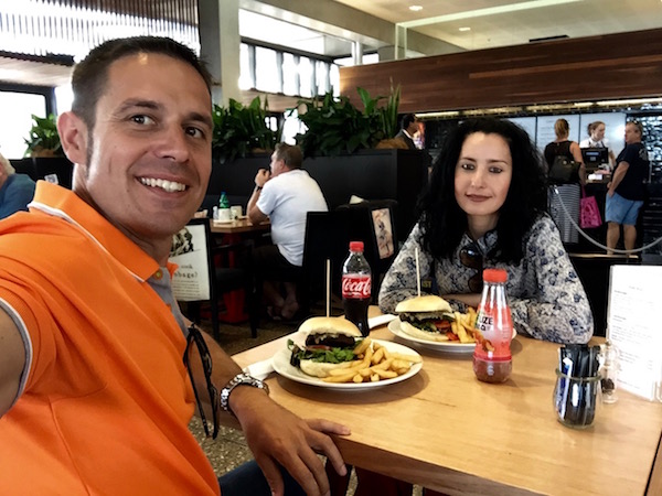 Tocaba la hora de almorzar, hoy nos comimos sopa, sándwich, que compramos en un supermercado. Una vez acabada la comida, nos fuimos al hotel para recoger el equipaje y trasladarnos hasta el Aeropuerto Internacional de Canberra. Una vez que llegamos al aeropuerto vimos que nuestro vuelo con destino a Sídney había sido cancelado. Hablamos en el mostrador con el personal de la compañía y nos reubicaron en el siguiente vuelo. Salimos casi 1 h y 30 minutos más tarde. El vuelo fue operado por la compañía aérea Qantas Airways, con una duración de 55 minutos.