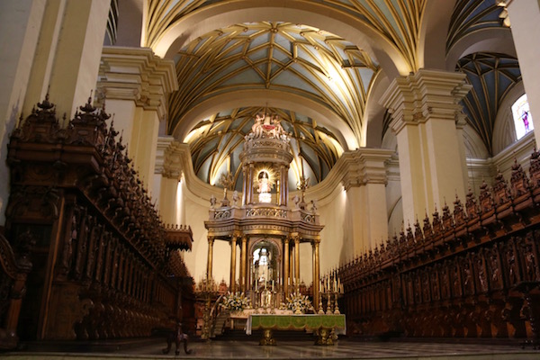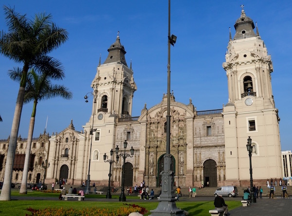 Nos trasladamos al centro histórico de la ciudad, visitamos la Catedral de Lima, fue comenzada a edificar en el año 1535, sobre un antiguo templo (puma Inti) de estilo renacentista. Tomó el título de catedral en el año 1543 por el Papa Pablo II. En 1564 fue reconstruido el templo tomando parecido a la catedral de Sevilla. Se terminó en el año 1605, tras el terremoto que se provocó en el año 1746 quedo destruida. En el año 1748 se comenzó a reconstruir siendo acabada en 1758. En el interior se encuentra unas criptas donde se guardan los restos de Francisco Pizarro y de Nicolás Rivera. También podemos destacar la capilla dedicada a la Inmaculada, de estilo barroco, el retablo de San Juan Bautista, el museo de arte religioso donde hay una gran colección de esculturas, pinturas, etc. En el interior se permiten hacer fotografías pero sin flash. Abierto de lunes a viernes de 9:00 h a 17:00 h sábados de 10:00 h a 13:00 h La entrada nos costó de 30 soles por persona (7,96 € aproximadamente) También hay la posibilidad de visitas guiadas en varios idiomas (español, inglés, francés, portugués, italiano). El Email: catedraldelima@yahooes Se encuentra en Jirón Carabaya.