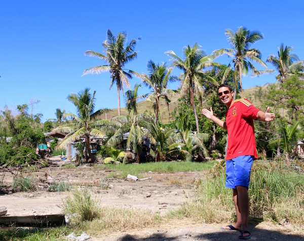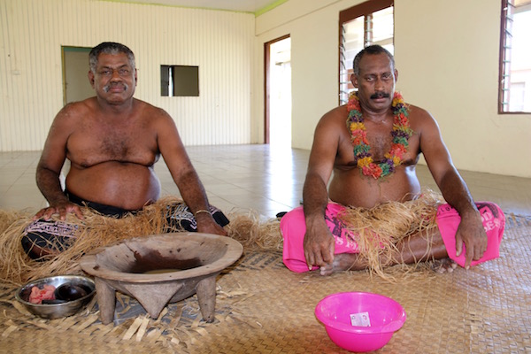 Nos despertamos desayunamos y una vez ya, con energías repuestas, nos fuimos a visitar un poblado nativo de los alrededores, la actividad nos costó 89 dólares fiyiano por persona (38,85 € aproximadamente). Tomamos una embarcación durante casi 1 h. hasta llegar al poblado Fiyi. Al chico que nos llevó no le permitían permanecer en el lugar, se marchó y las 12:00 h regresaría a por nosotros. Lo único que nos dijo, que teníamos que bebernos el champán, era muy importante. Salieron dos jefes de las tribus para recibirnos, estábamos solos, éramos los únicos blancos guiris en la isla, nos adentramos en una nave, nos dijeron que nos sentáramos en el suelo y comenzó el espectáculo ¡Acción! Estos dos hombres que la verdad no tenía cara de muchos amigos eran muy gordos, con falda hawaiana, no llevaban camiseta puesta, sudaban un montón (a 40 grados que estábamos).