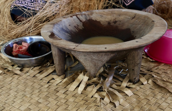 Comenzó el rito en su idioma, uno de ellos cogió un cuenco hecho un liquidó de color un poco beis (amarillento). Tomó un trozo de trapo con un poco de polvo, lo mojó en el líquido escurrió, lo que salió lo hecho en unas peladuras de coco. Nos dijeron tomar, os damos la bienvenida, Sergio se lo tomo entero y yo realmente no sabía qué hacer si salir corriendo o quedarme. Yo dije, no me lo bebo, no me siento bien del estómago, no puedo, no os podéis hacer una idea de la manera que me miraron los dos jefes de la tribu, los ojos se le salían de las órbitas. Pues nada a respirar hondo y para dentro, os puedo decir qué fue una sensación un poco rara, probar eso, y haber visto el proceso de fabricación, sinceramente no sé puede explicar el sabor que tenía, pero no nos gustó para nada. Nos pidieron que diéramos una propina, para contribuir al ecosistema. Le dejamos algo y nos fuimos a visitar la aldea.