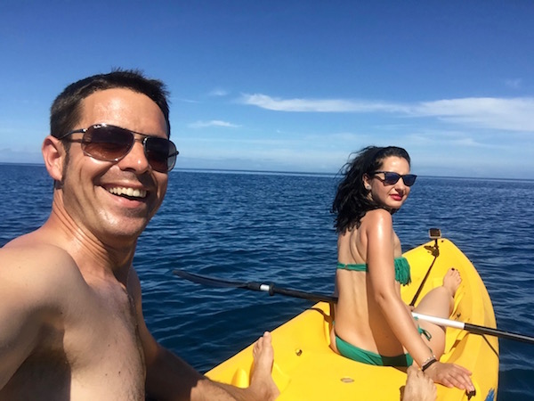 ¡Hoy no sonó el despertador! Nos levantamos tranquilamente, desayunamos y cogimos una kayak y nos fuimos a un islote que se encontraba a 1 hora haciendo kayak desde el hotel. ¡Pobre Sergio!, fue el que se pasó todo el rato remando para llegar al lugar, bueno alguien tenía que hacer las grabaciones con la Gopro, jaja. Llegamos, estábamos solos, nos bañamos, tomamos fotografías. Totalmente solos en el paraíso.