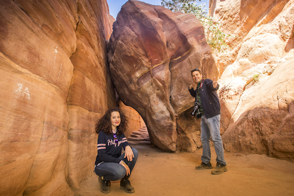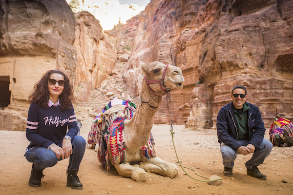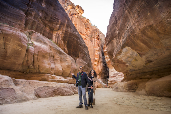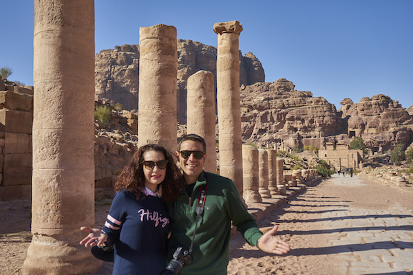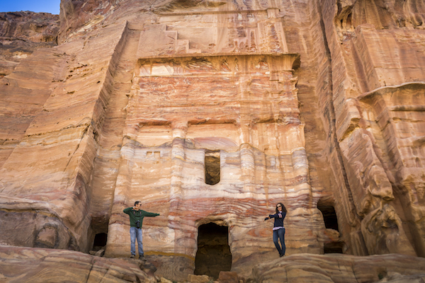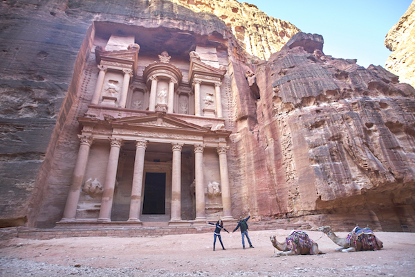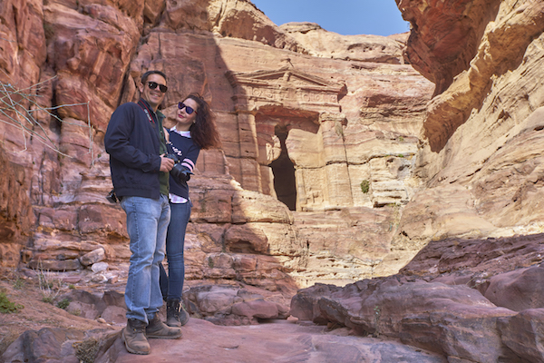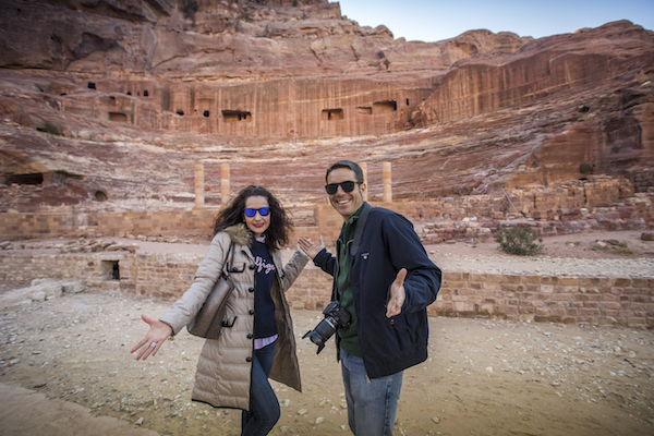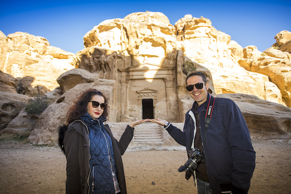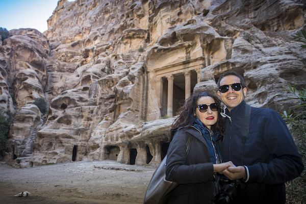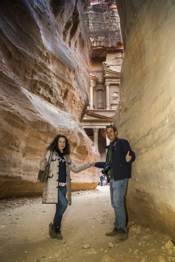 Petra fue tallada por el pueblo nabateo en el siglo VII a.C. es una ciudad que está excava en piedra arenisca, en una sola pieza. Si sitúa en el valle de Angosto, se extiende desde el mar Muerto hasta el Golfo de Aqaba. Su mayor esplendor lo consiguió en el siglo I d.C. siendo un importante lugar de comercio, fue el camino que unía las rutas de seda, especias e incienso con el sur de Arabia, China y la India con Egipto, Siria, Grecia y Roma. Pero quedó en el olvido para Occidente, cuando desapareció la civilización nabatea. En el año 1812, era encontrada por Johann Burkhardt, un explorador aventurero, sueco. En el año 1985, fue Declarada Patrimonio de la Humanidad por la Unesco, y en 2007 nombrada como una de las 7 Maravillas del Mundo Moderno. Al formar parte de una de las 7 Maravillas, pensábamos encontrarnos una gran cantidad de gente y aglomeraciones en el lugar. Para sorpresa nuestra, no había casi nadie. Esto es debido por la cercanía con los conflictos de Medio Oriente. Hay un gran problema en el Estado Islámico y también por la situación en Siria e Irak, países vecinos de frontera con Jordania. Nosotros nos lo hemos pensado mucho para hacer este viaje, por este tema. Pero bueno, aquí estamos disfrutando de un país increíble y cumpliendo un sueño. Os podemos decir que es un país seguro, hay mucha policía y el ejército militar están por todas las calles controlando las zonas. Petra es mucho más que el Tesoro, Al Khazna esa fachada que muestra “Indiana Jones y la Última Cruzada” donde se podrá ver el Monasterio de Ad-Deir, Tumbas Reales, un Anfiteatro, la Calle de las Columnas, el Templo de Qasr al-Bint, el Museo Arqueológico de Petra y otros lugares menos visitados.
