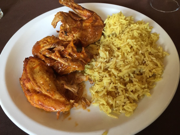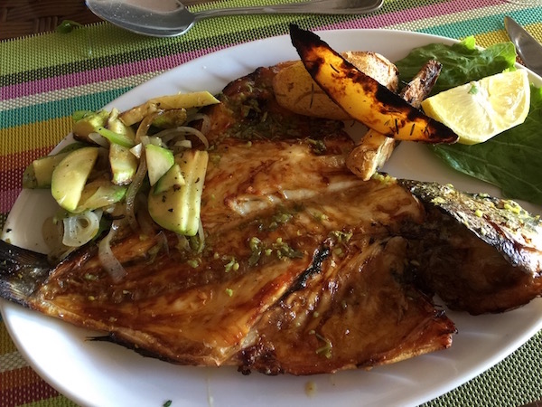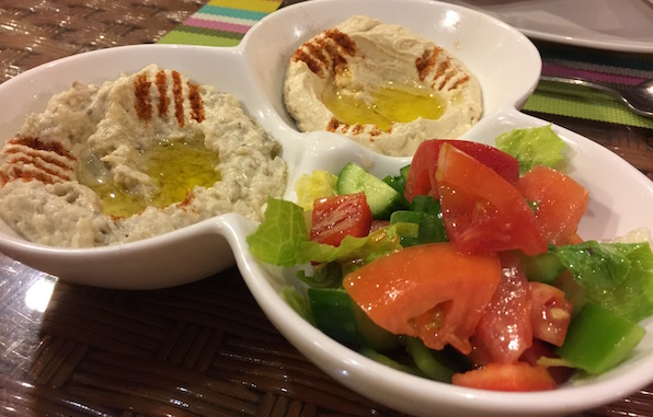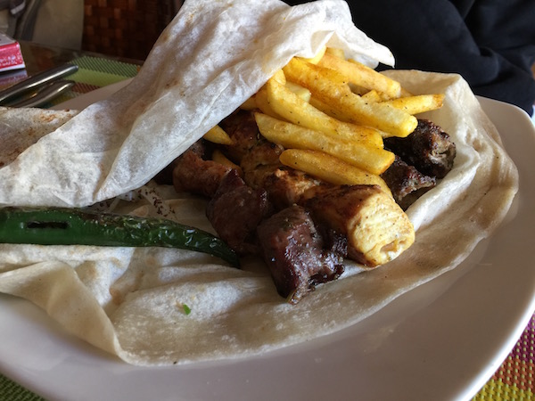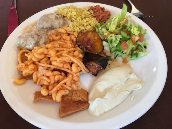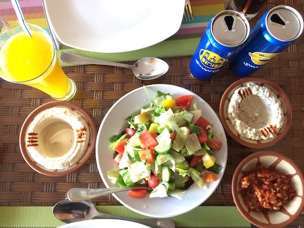 Terminada la visita nos volvimos hasta Amman, donde almorzamos en un restaurante local, que nos encontramos por el camino. Donde tuvimos el primer contacto con la gastronomía jordana, probamos diferentes cremas como: el Hummus es una salsa hecha con garbanzos, aceite de oliva y zumo de limón, el Khubez, el pan jordano, Shish Kebab, es un plato que lleva diferentes carnes como: cordero, pollo, ternera con salsa picante, acompañado de cebolla, tomate, como bebida pedimos una coca cola, y una botella de agua mineral sin gas. Pagamos 34 dinares jordanos en total (45,26 € aproximadamente)
