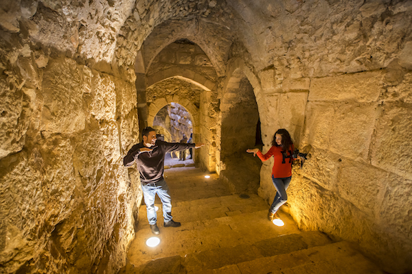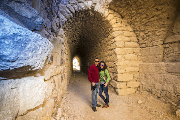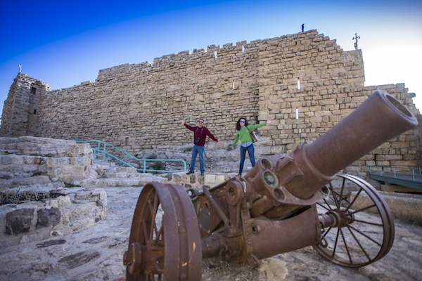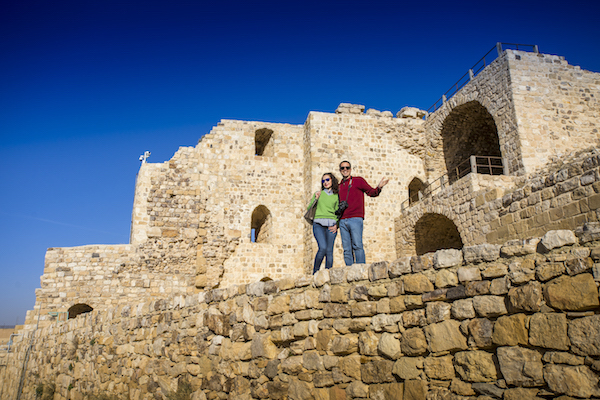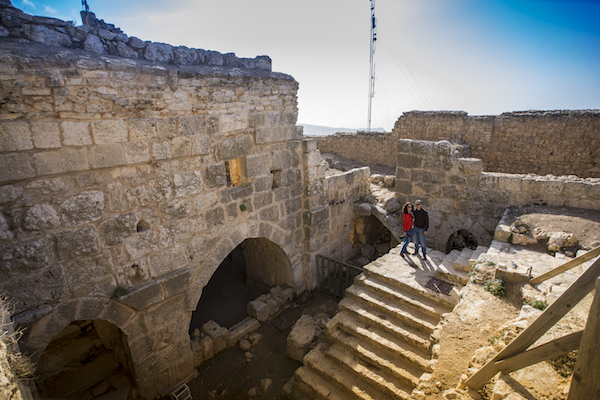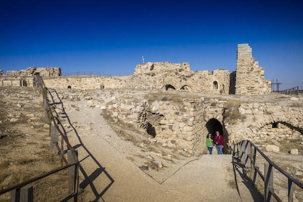Esta fortificación fue levantada en el año 1140, sobre los restos de una antigua ciudad moabita, en una montaña a 930 metros de altitud. Este castillo tiene una dimensiones de 220 metros de longitud y 125 metros de ancho por la parte norte, en el lado sur se estrecha llegando a tener 40 metros de ancho. Controlaba las rutas de comercio que unían Damasco, Egipto y la Meca. Aparece mencionado en la Biblia. Fue un importante fuerte entre las ciudades de Jerusalén y Aqaba. Sufrió varios ataques durante siglos, teniendo que ser remodelado en varias ocasiones. Desde el lugar se puede ver el mar Muerto. Cruzamos el puente, una vez que bajamos el primer tramo de escaleras nos adentramos en los inicios de pasadizos, galerías y salones. Aquí comenzábamos un recorrido sin mapa, ni direcciones que indicasen a donde debías dirigirte, nos dejamos guiar por el instinto de explorador, mejor dicho por Sergio, porque yo, soy un desastre para orientarme. Aconsejamos llevar una linterna, en algunas zonas apenas hay luz. Una vez acabado el recorrido. En la cara oeste del castillo hay un museo, aunque cuando nosotros lo visitamos estaba cerrado. Horario de visitas en invierno de 8:00 h a 16:00 h, en verano de 8:00 h a 19:00 h. La visita nos llevó 1 h. aproximadamente. La entrada nos costó 2 dinares jordanos por persona (2,68 € aproximadamente).