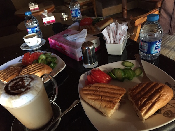 Al día siguiente nos levantamos, salimos del hotel y en una Cafetería Coffee Shope, nos paramos a desayunar donde nos comimos un sandwich de atún y un café con leche. Pagamos un total de 12 dinares jordanos (15,98 € aprox.)