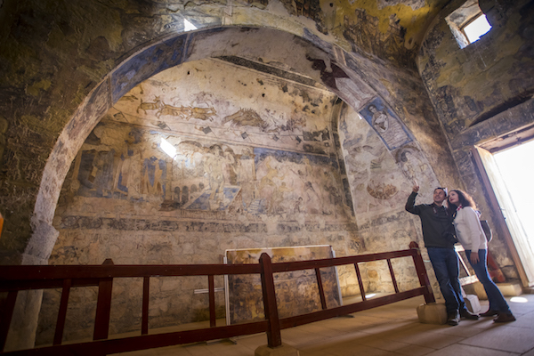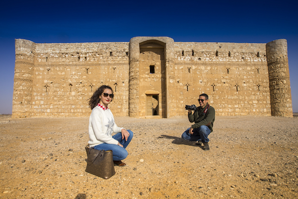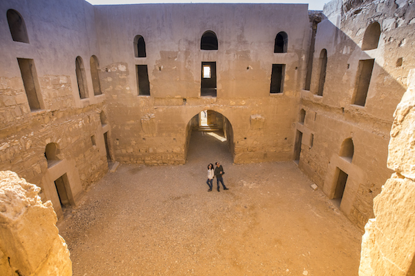 Antes de que sonara el despertador ya teníamos los ojos abiertos, nos arreglamos y empezamos el día con un buen desayuno que nos tomamos en el hotel. Hoy íbamos a visitar los Castillos del Desierto. Desde Amman tardamos una 1 h y 50 minutos en llegar. Por la ventanilla del coche podíamos ver paisajes totalmente desérticos. Los Castillos del Desierto fueron levantados en los siglos VII y XI, por el califa Omeya Walid I. Unos fueron utilizados como pabellones de descanso, fuertes militares, etc. Fue descubierto en el año 1898 por Alois Musil. Han sido declarados Patrimonio de la Humanidad por la Unesco en 1985. Llegamos al primer Castillo Qusayr Amra, en pleno desierto jordano. La fortificación hecha en caliza roja y feldespato. Posee unos impresionantes frescos que muestran figuras humanas, animales y zodiacales. Aunque por fuera se ve un simple castillo, a nosotros nos ha impresionado mucho su interior, presenta un estado de ruinas, se han llevado acabó ya tareas de restauración en el lugar, pero queda trabajo por hacer. Está compuesto por tres bóvedas y una pequeña cúpula. Hoy en día solo queda en pie unos baños tipo romanos. Sus dimensiones son: la sala principal tiene una longitud de 13 metros y un ancho de 10,4 metros, la sala fría y templada con una longitud de 7 metros y un ancho de 3,67 metros, la sala caliente tiene un largo de 5 metros y un ancho de 3 metros, la sala de calefacción tiene una extensión de 7,74 metros y un ancho de 5,16 metros, el sistema hidráulico tiene una longitud de 9,10 metros y un ancho de 4,4 metros. La visita nos llevó alrededor de 1 h. aproximadamente. El horario de visitas es de lunes a domingo. La entrada nos costó 1 dinar jordano por persona (1,34 € aproximadamente). La compramos en el centro de visitantes que está a unos pocos metros del castillo. Al lado también hay una jaima donde se puede tomar un café, té, etc.