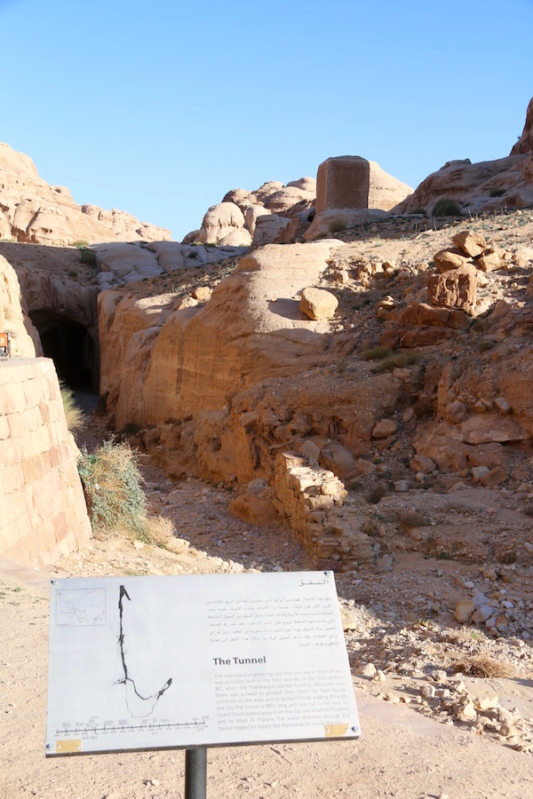 El túnel que fue excavado en la roca con una longitud de 88 metros por los nabateos, para que las aguas de las lluvias y las riadas del Wadi Musa desde el Siq hacia el cauce de Wadi Al Mudhlim y del Wadi Al Matah.